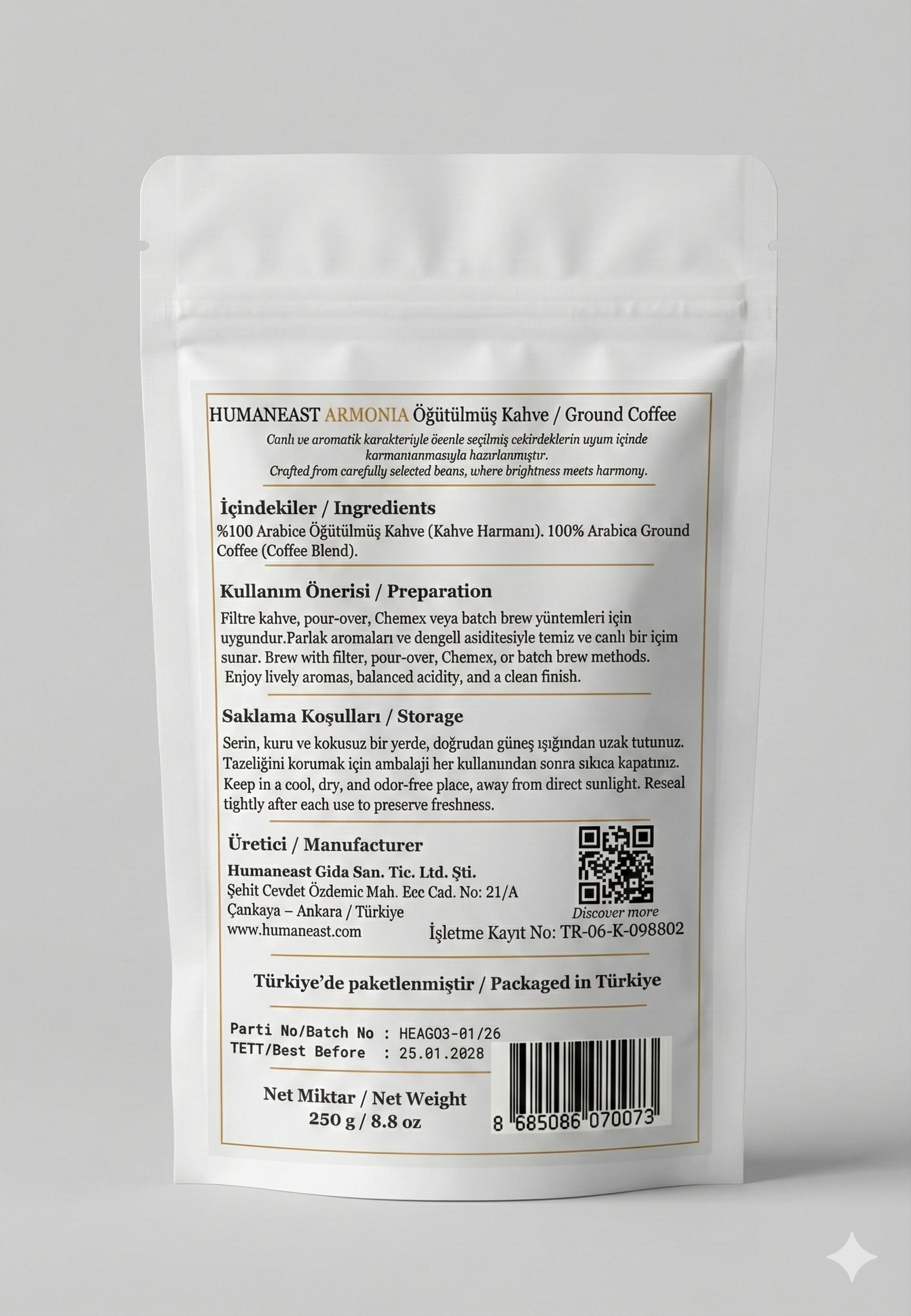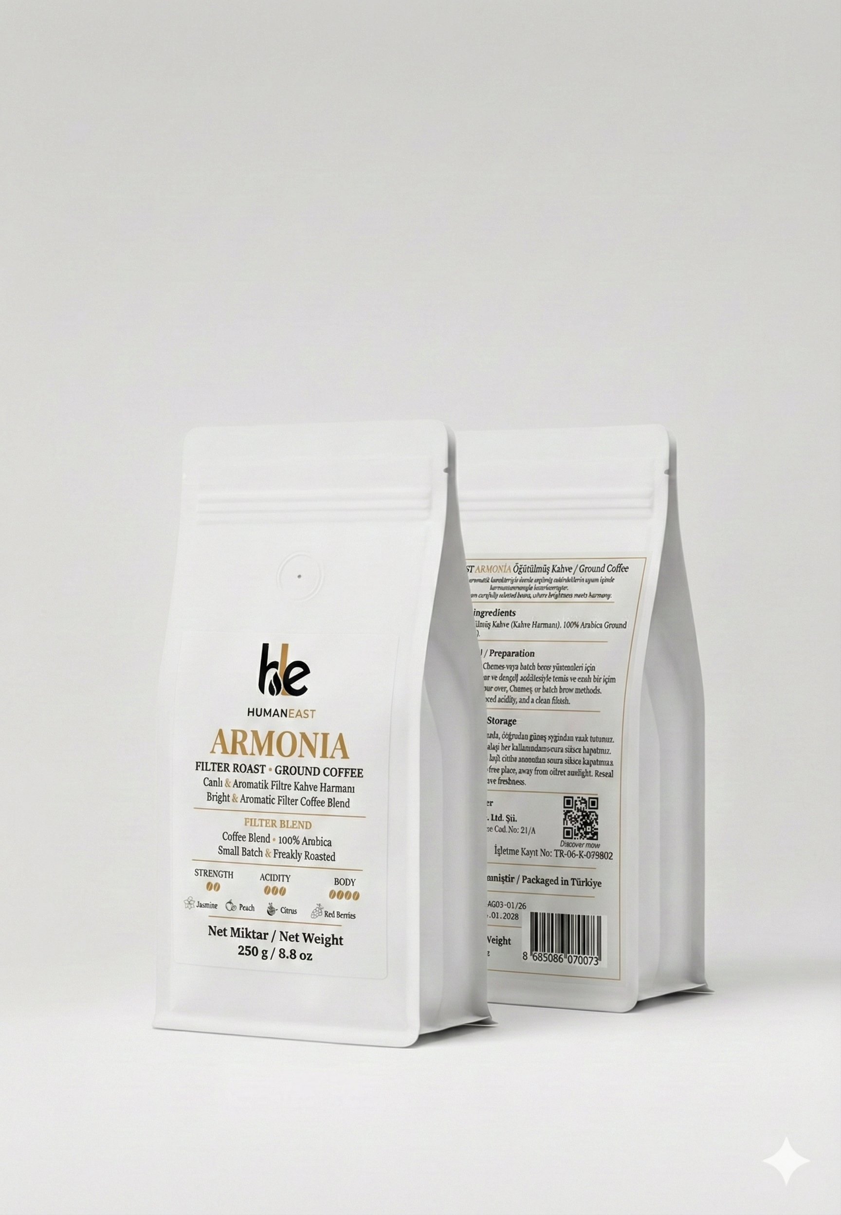 Humaneast Armonia, canlı aromaları ve dengeli yapısıyla karakterli bir filtre kahve harmanıdır. Colombia, Ethiopia ve Kenya çekirdeklerinin uyumu, fincanda parlak ve enerjik bir deneyim sunar.